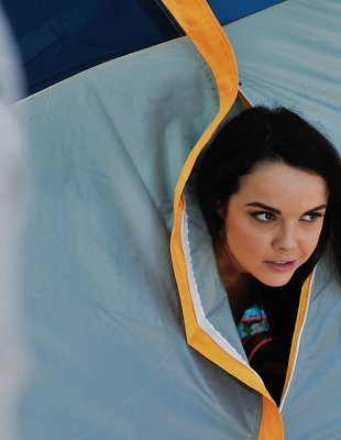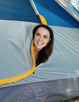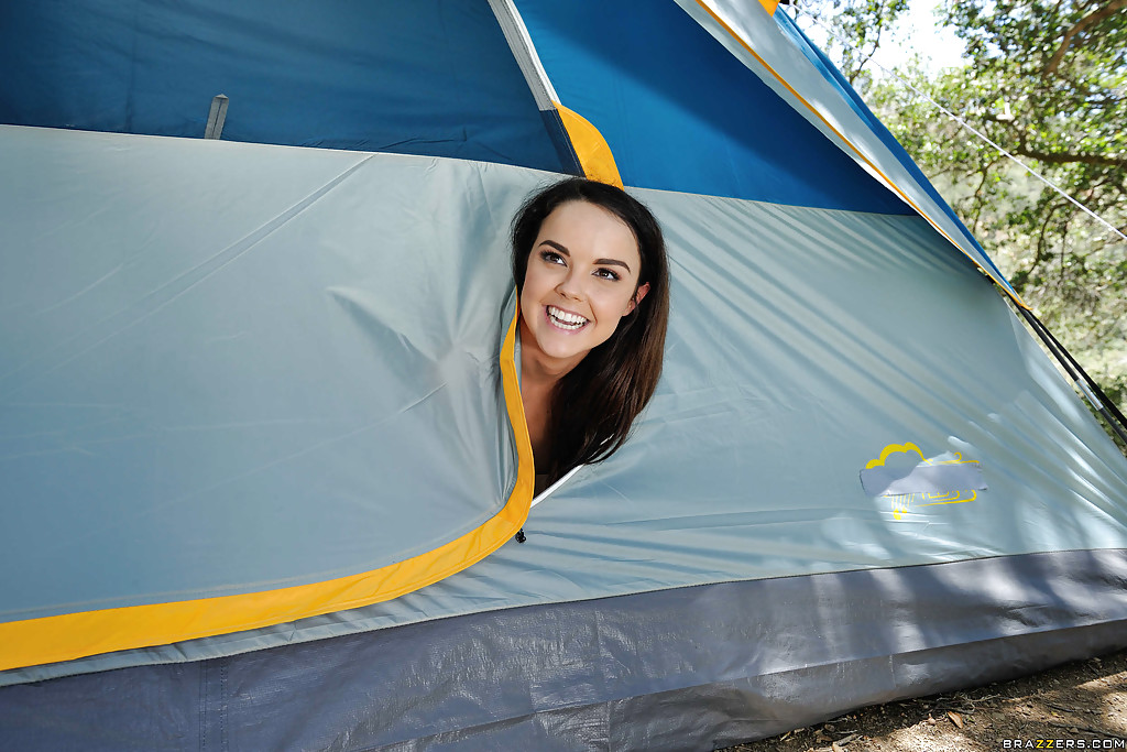 Паренек со своей подругой выбрались на природу с палаткой, чтобы устроить не хилый перепихон. Все началось с того, что брюнетка разделась в палатке, а чувак дал ей пососать свой хуй. Дальше парочка приступила к жаркому сексу в палатке. Парень долго ебет свою сисястую подругу и лижет ей очко.