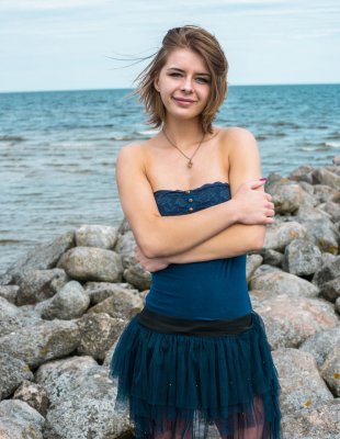 Обаятельная красавица снимается в обнаженной фотосессии на скалистом берегу у моря голой. Девушка по позирует с разных ракурсов и мило улыбается, когда пытается прикрыть свою большую грудь, но позже без всякого стыда показывает ее и свою киску.