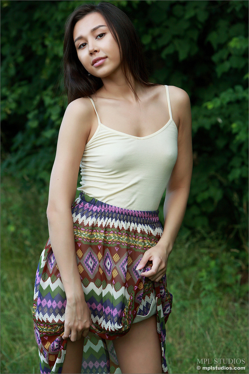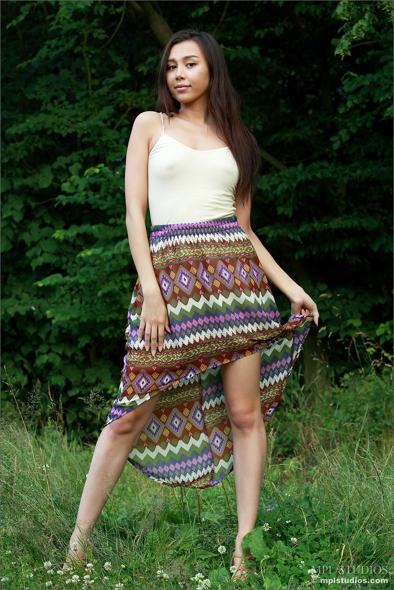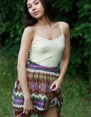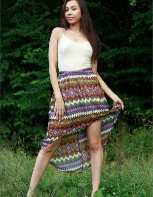 Красивая фотосессия очаровательной девушки была бы обычной: лест, зелень, цветочки. Но эта стройная красотка предпочитает сниматься голой в лесу. Девушка без стеснения снимает свое летнее платье и тут же ложится раком на зеленую травку показывая свою попку.