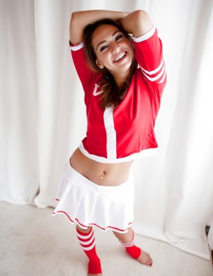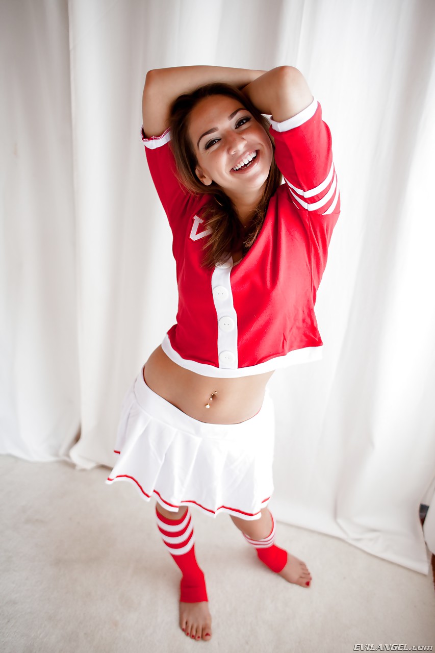 Красивая американская черлидерша соблазнительно выглядит в красной униформе своей команды, но особенно сексуальной она становится , когда начинает раздеваться и остается без трусов, которые не мешают наслаждаться видом её упругой попы и бритой киски.
