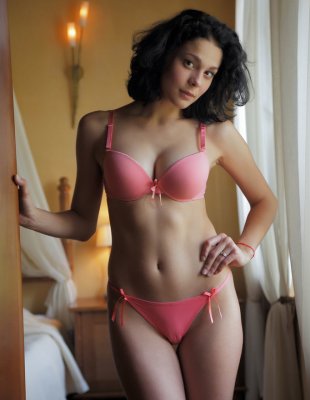Симпатичная кудрявая брюнетка позирует сначала в розовом нижнем белье, а потом постепенно снимает его. Теперь все желающие имеют возможность любоваться ее стоячими упругими сисечками и аккуратными дырочками. Модель встает раком и манит к себе, намекая на отменный горячий секс.