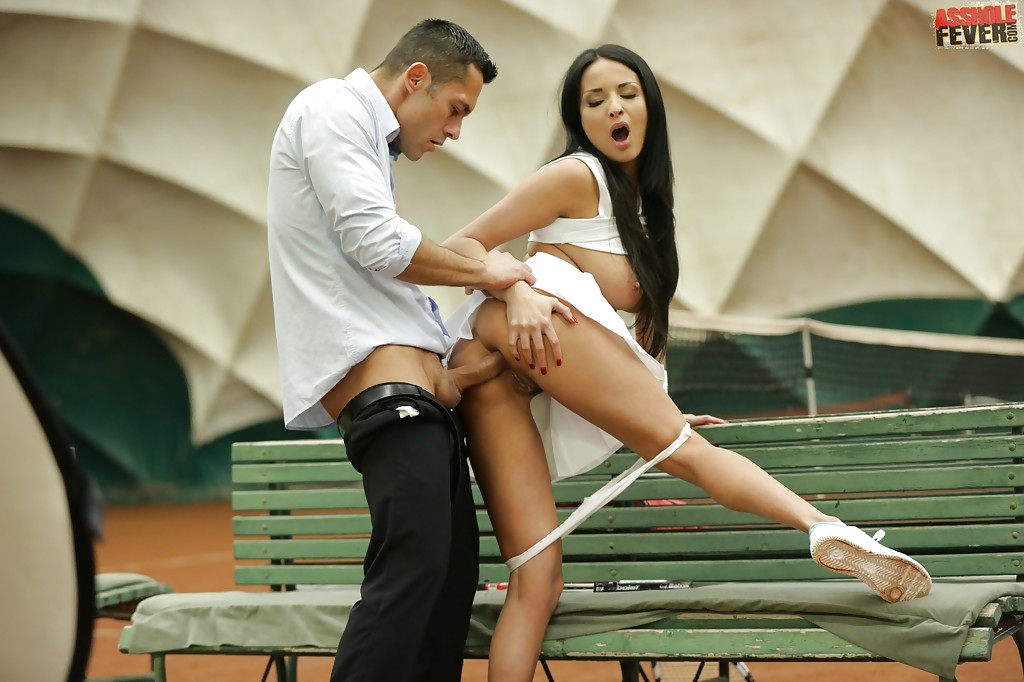 Развратная брюнетка после анального соития с приятелем глотает сперму и развлекается с ней кончиком языка. Сначала красивая пара занималась поркой на скамейке. Девушка в короткой юбке белого цвета встала раком и уткнулась попой в огромный стержень. Потом модель улеглась на спину, чтобы красавчик анально долбил ее теперь в такой позе. После оргазма красотка сглотнула свежий спермак.