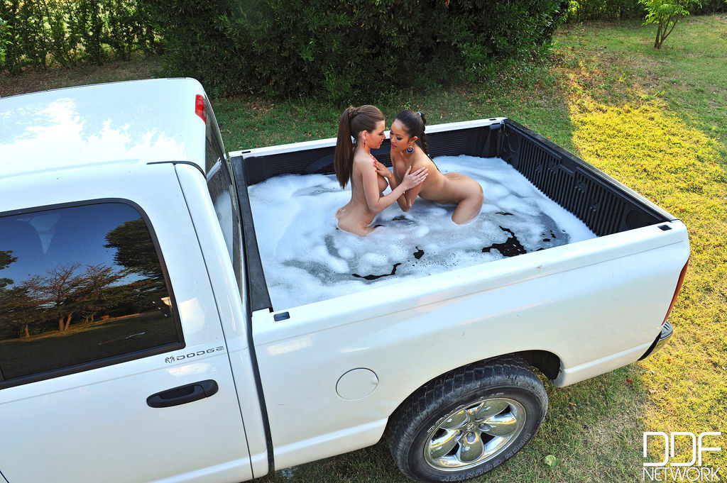 Дико возбужденные голые лесбиянки показывают друг другу мокрощелки, устроившись в мини бассейне, сделанном из багажника автомобиля. Подруги лижутся, а потом теребят ароматные пилотки друг друга кончиками языков. Им нравится резвится в необычных позах и ощущать прикосновения пальцев к клиторкам. Подруги азиатской внешности практически одновременно кончают.