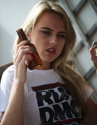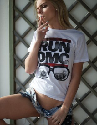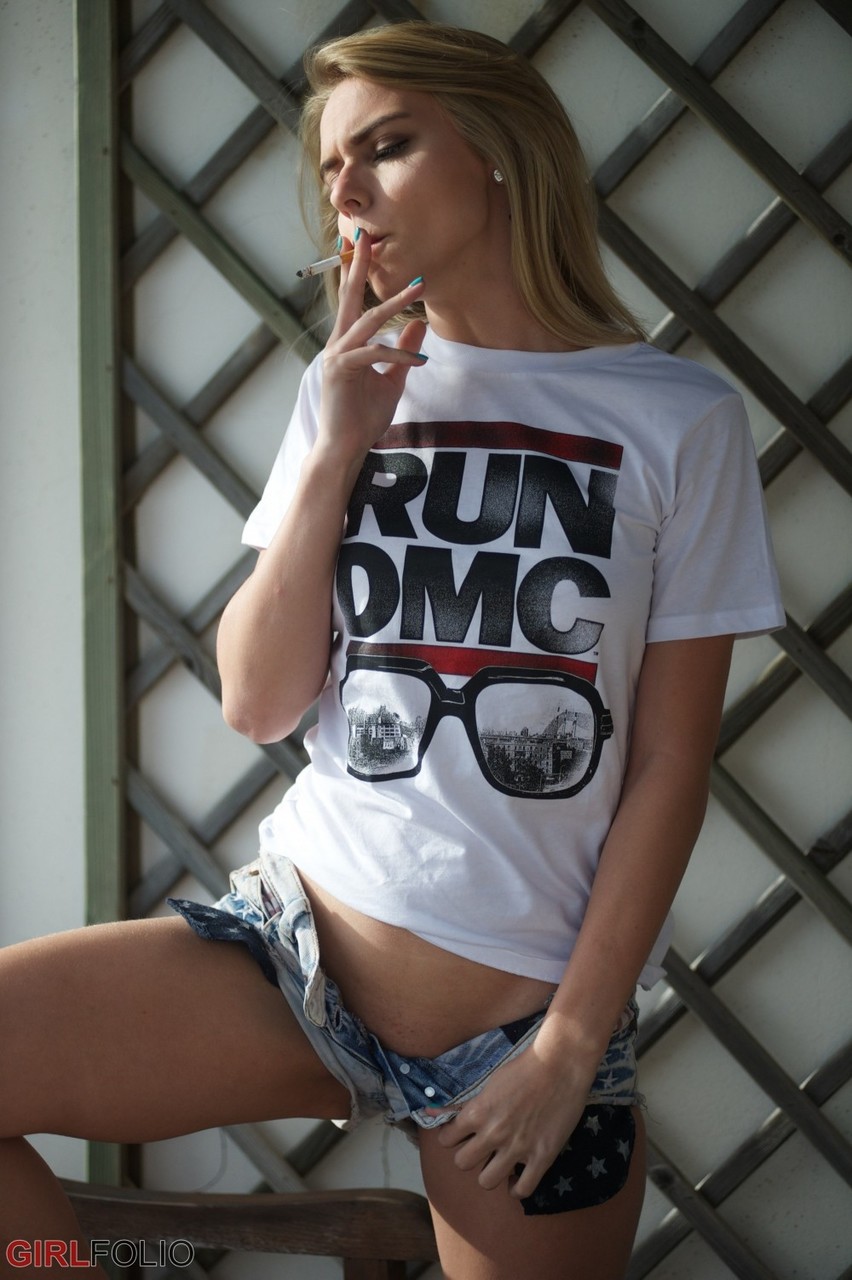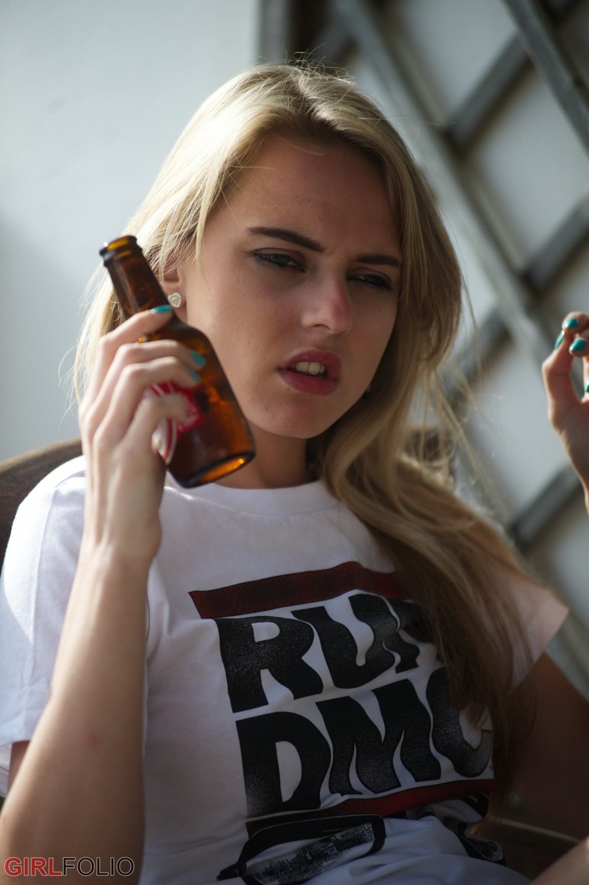 Выпив холодного пивка молодая блондинка 29 лет решила курнуть сигаретку и за одно раздеться, чтобы по позировать в возбуждающем виде с голой пиздой.