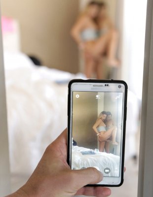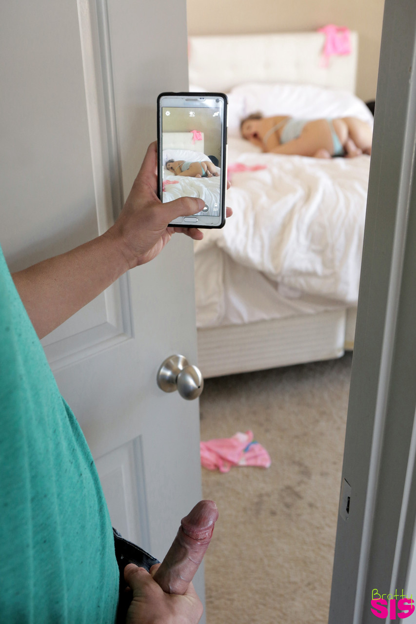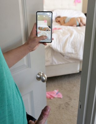 Красотка блондинка ранним утром решила немного расслабиться при помощи резинового дилдо, но забыла, что дома она не одна и спалилась перед парнем. Застукав девушку он решил ей помочь и как следует трахнул обкончав всю пизденку.