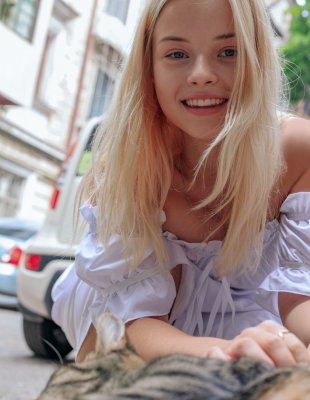 Красивая блондинка с блестящей улыбкой раздевается для фотосета сняв трусики и показывает свою большую молодую попку.