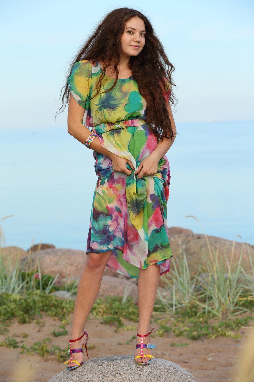 Обворожительная красотка с длинными кудрявыми волосами совершенно без комплексов, разгуливает по вечернему пляжу в платье под которым нет трусов. Да и не нужны они такой красотке.