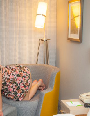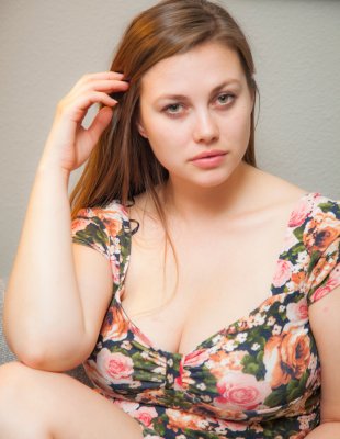 Секси пышка с длинными волосами и в платье откровенно позирует перед камерой в домашних условиях.