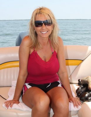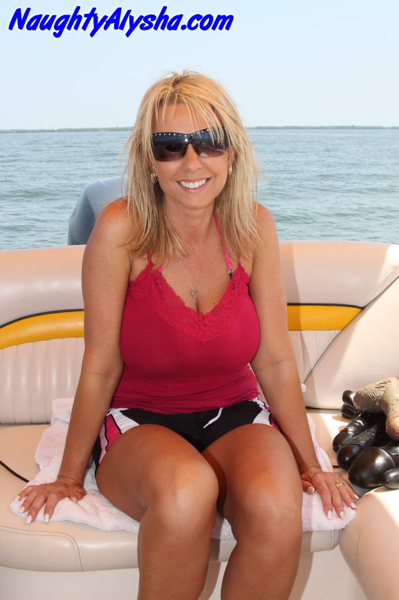 Зрелая но сексуальная женщина захотела провести шикарный отдых на катере в компании своих огромных секс игрушек. Для этого дама взяла здоровенные черные дилдо и стала растягивать свою пизду.