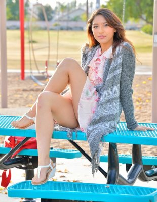 Молодая красотка решила по качаться на качелях, но совершенно забыла что она не надела трусики и юбка задралась так что можно было легко увидеть её пизду.
