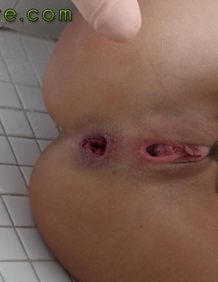 Блондинка с подтянутой загорелой попкой любит развлечься в душе с двумя огромными резиновыми дилдо. Один она сует в пизду, а другим расшаривает свою попку.