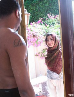 Арабка в платке никогда прежде не видела больших членов и с огромным удовольствием занялась сексом с негром. Ей очень понравилось когда здоровяк спустил в нее сперму.