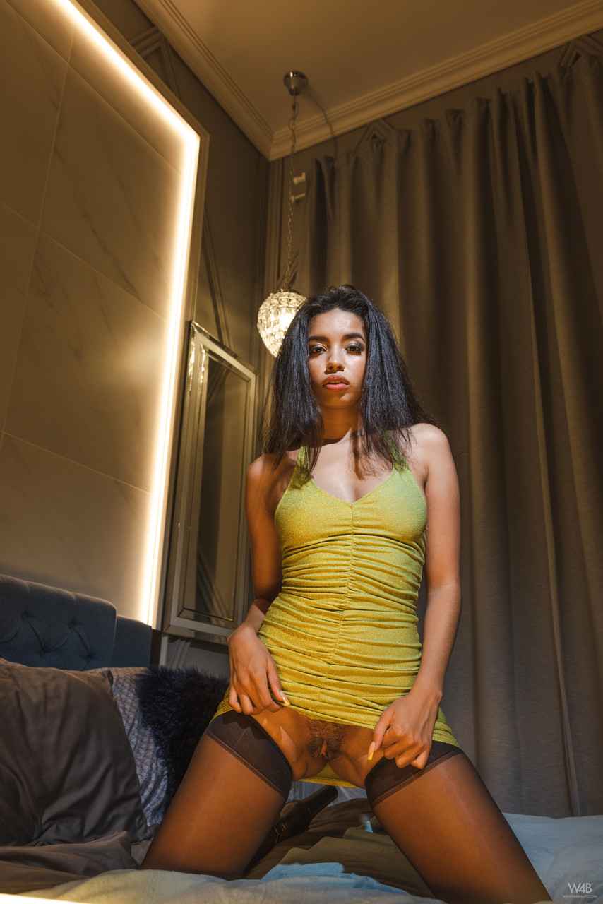 Очаровательная мулатка надев своё сексуальное белье с черными чулками, включила секс машину со страпоном на конце и принялась трахаться с бездушной машиной)