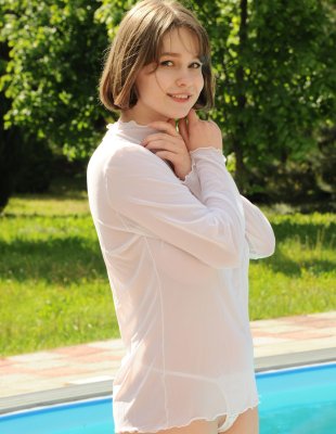 Милашка нырнула в бассейн в мокрой майке, а когда вышла из него её большие сиськи стали видны. Девушка не растерялась и сняла все остальное белье и выставила на показа свою сексуальную стройную фигуру.