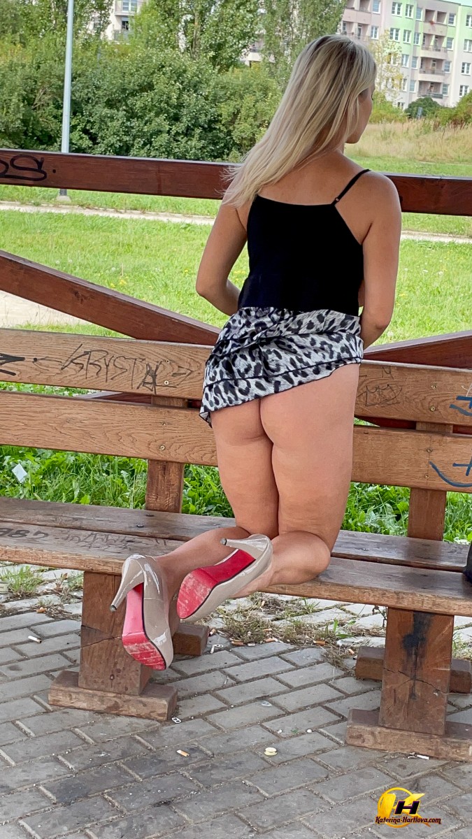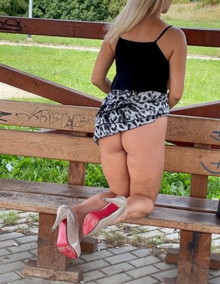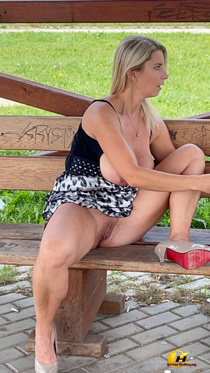 Красавица с большими натуральными сиськами шалить на камеру в парке сидя на лавочке теребя клитор.