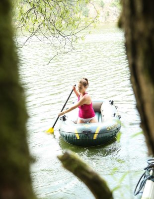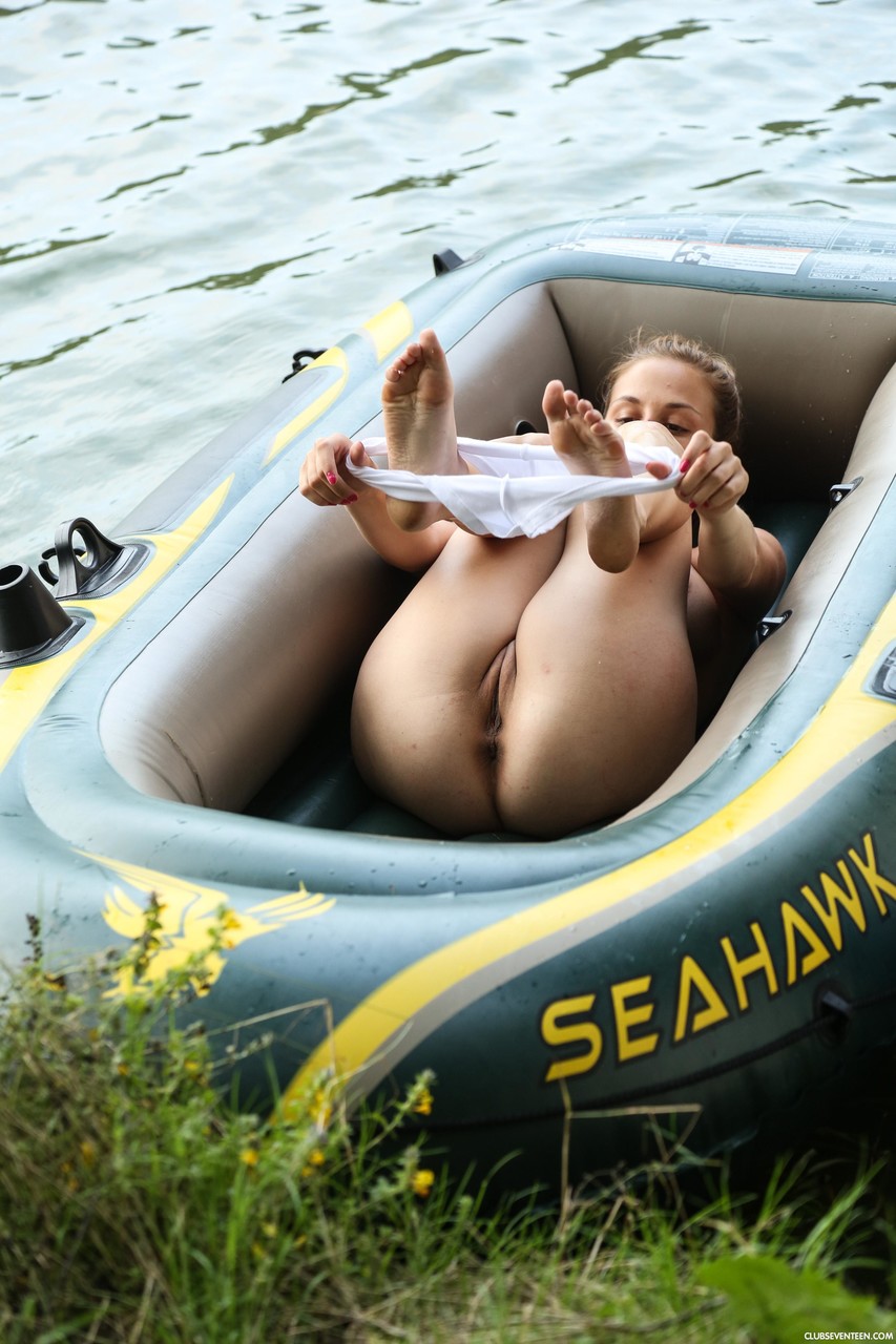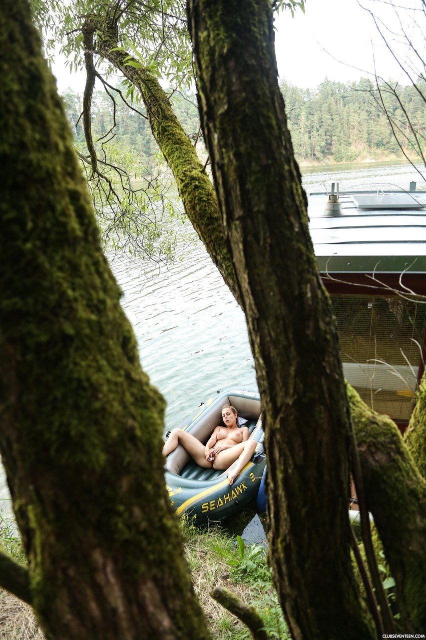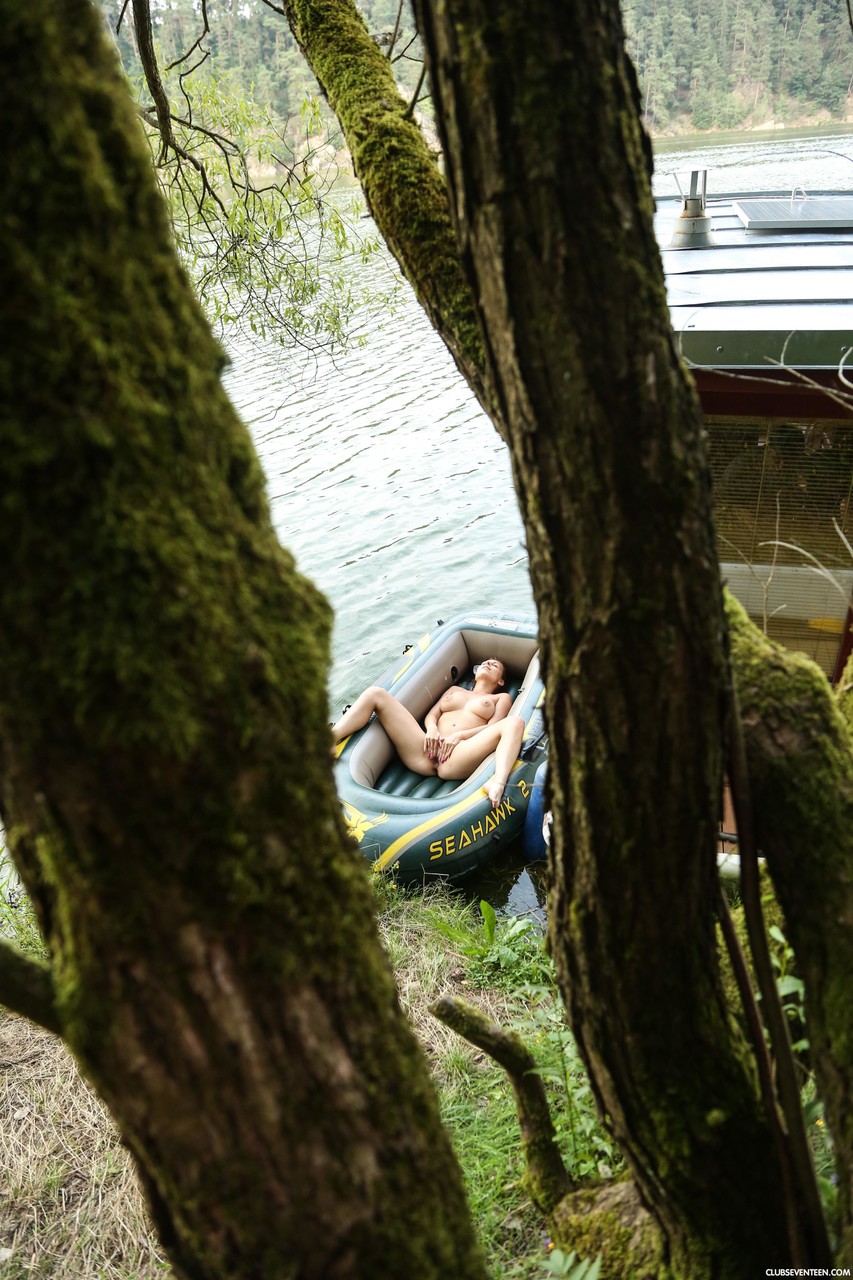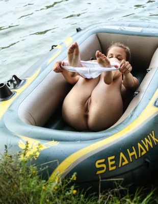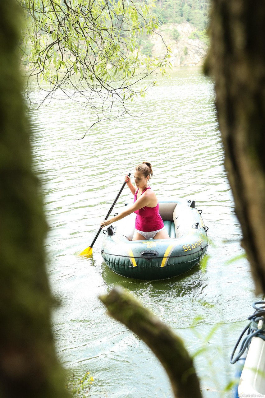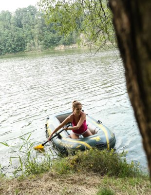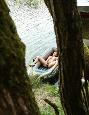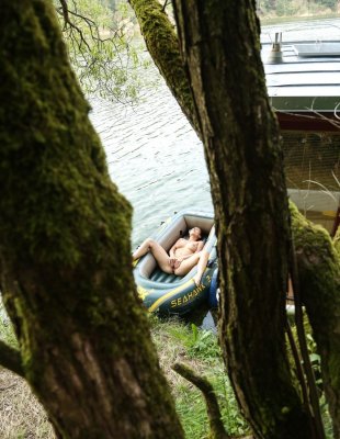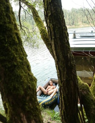 Красотка с большими сиськами подплыла на лодке к берегу, где тайком укрылась среди деревьев. Но мимо проходил паренек, который спалил её и тайком снял на телефон.