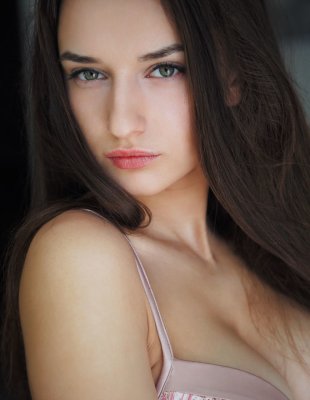 Стройная молодая брюнетка на фотосессии у фотографа легла на кровать и раздвинула ноги так что её половые губы приоткрылись и было видно киску целиком.