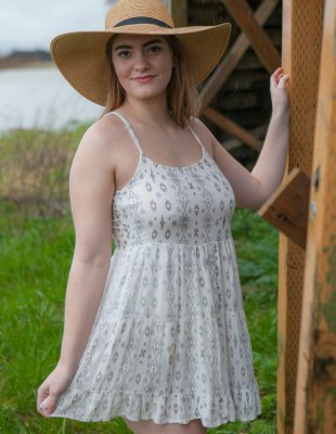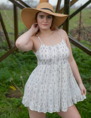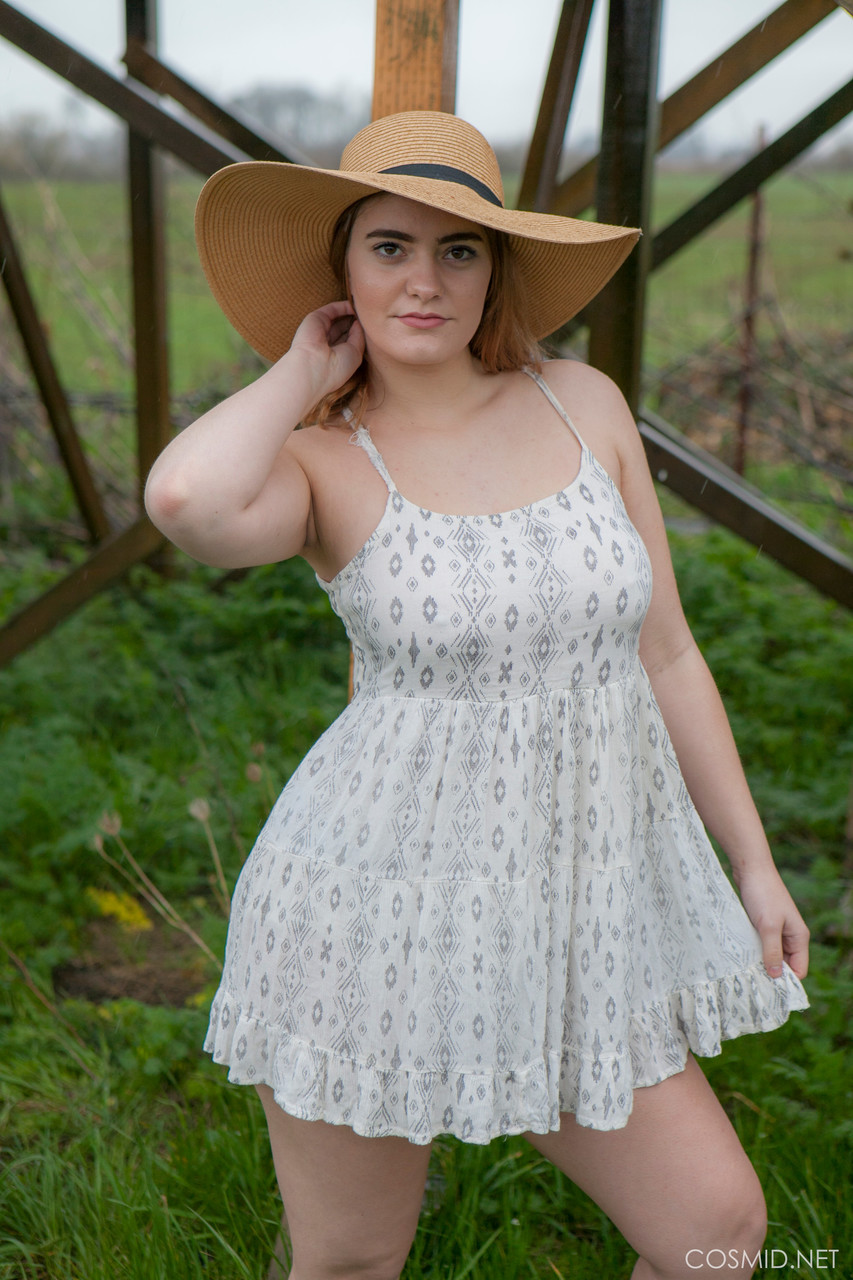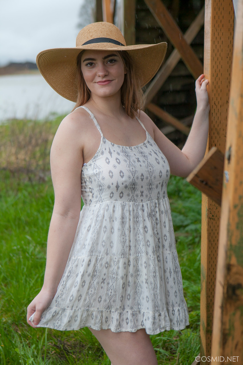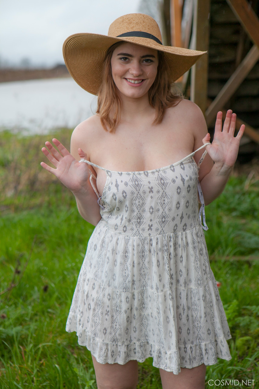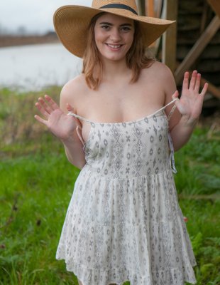 Молодая пышная красотка в соломенной шляпе, прогуливается в у озера и позирует без трусов сверкая аппетитной попкой и голой пиздой на камеру.