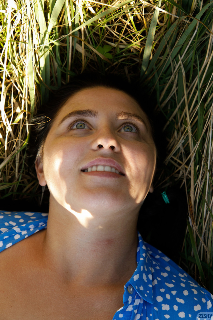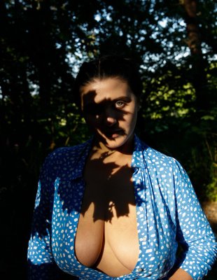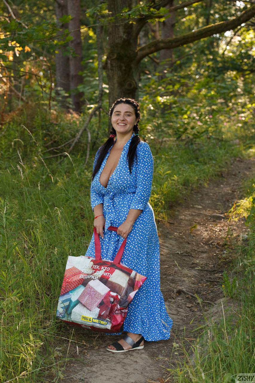 Сисястая красотка показывает огромные натуральные дойки на природе и светит пиздой под платьем