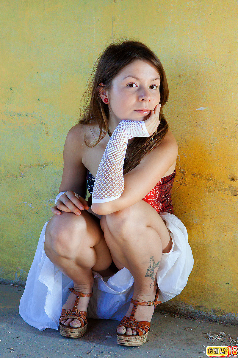 Молоденькая девчонка Emily Eighteen зашла в темный переулочек чтобы сделат несколько эротических снимков без трусиков.