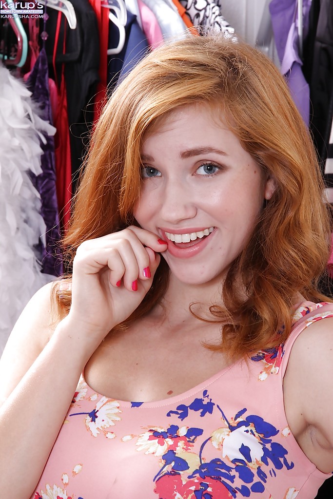 Изящная рыжая красотка зашла в гардероб чтобы сменить летнее платье. Раздевшись девушка решила заглянуть в зеркало и посмотреть на свою фигуру все ли с ней в порядке. Девушка стала позировать в очень сексуальных позах и даже сняла свои красные трусики и посмотрела на свою нежную киску.