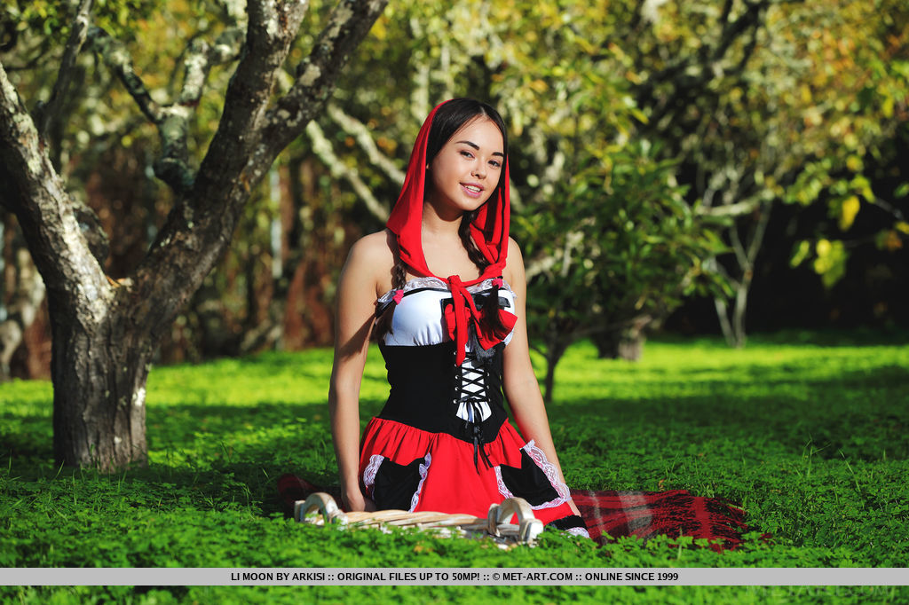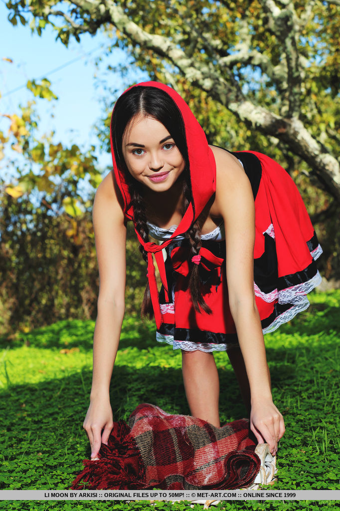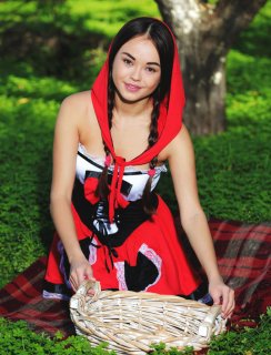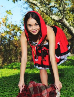 В красивом зеленом лесу красивая молодая девушка в одежде красной шапочке устроила голую фотосессию. Девушка нарядилась точь в точь как красная шапочка, но только без трусиков и стала позировать в таком виде на камеру. Стройная милашка очень постаралась перед фотографом и получились довольно красивое фотографии, где видно ее стройные ноги, молодые титечки, а так же красивую пизденку со всех ракурсов. Волк бы по любому натянул такую красную шапочку.
