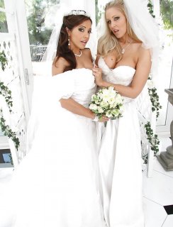 Две горячие порно модели устроили настоящую свадебную фотосессию в подвенечных платьях с подвязками и фатой. Они ярко позируют в своих белых нарядах до того момента пока не остаются почти голыми в чулках и фатой. Девки прижимаются по ближе к друг дружке своими смачными попками от который член стоит колом.
